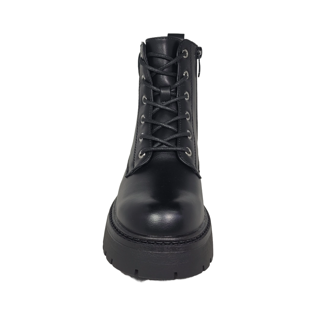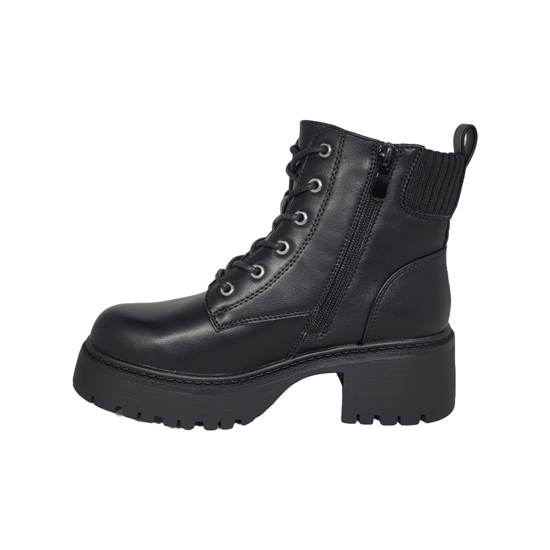 Material y diseño: Elaborados en eco-cuero liso con acabado sobrio y elegante; caña media con diseño estructurado que estiliza el tobillo.