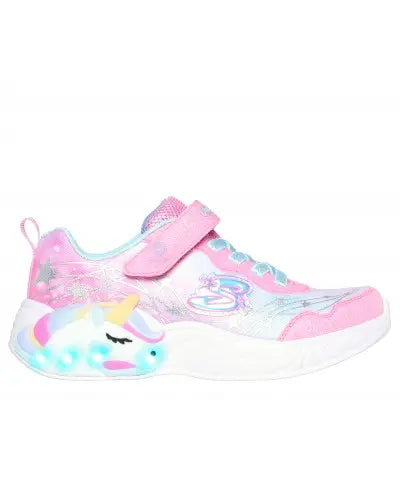 Alegra tu día con un poco de diversión con unicornios usando Skechers S-Lights®: Unicorn Dreams - Wishful Magic. Esta zapatilla con luces Magical Collection® con temática de unicornio presenta una parte superior sintética sombreada con detalle de estampado metálico, cordones elásticos con una correa ajustable en el empeine, entresuela adornada con unicornio y una plantilla cómoda acolchada.
