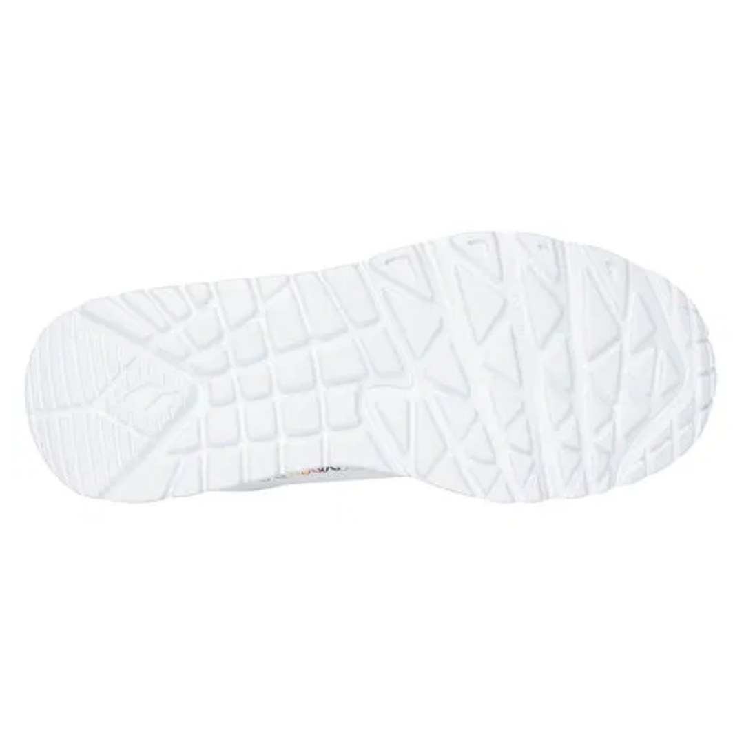 Color: Blanco con detalles multicolores, creando un efecto de arcoíris en la suela.