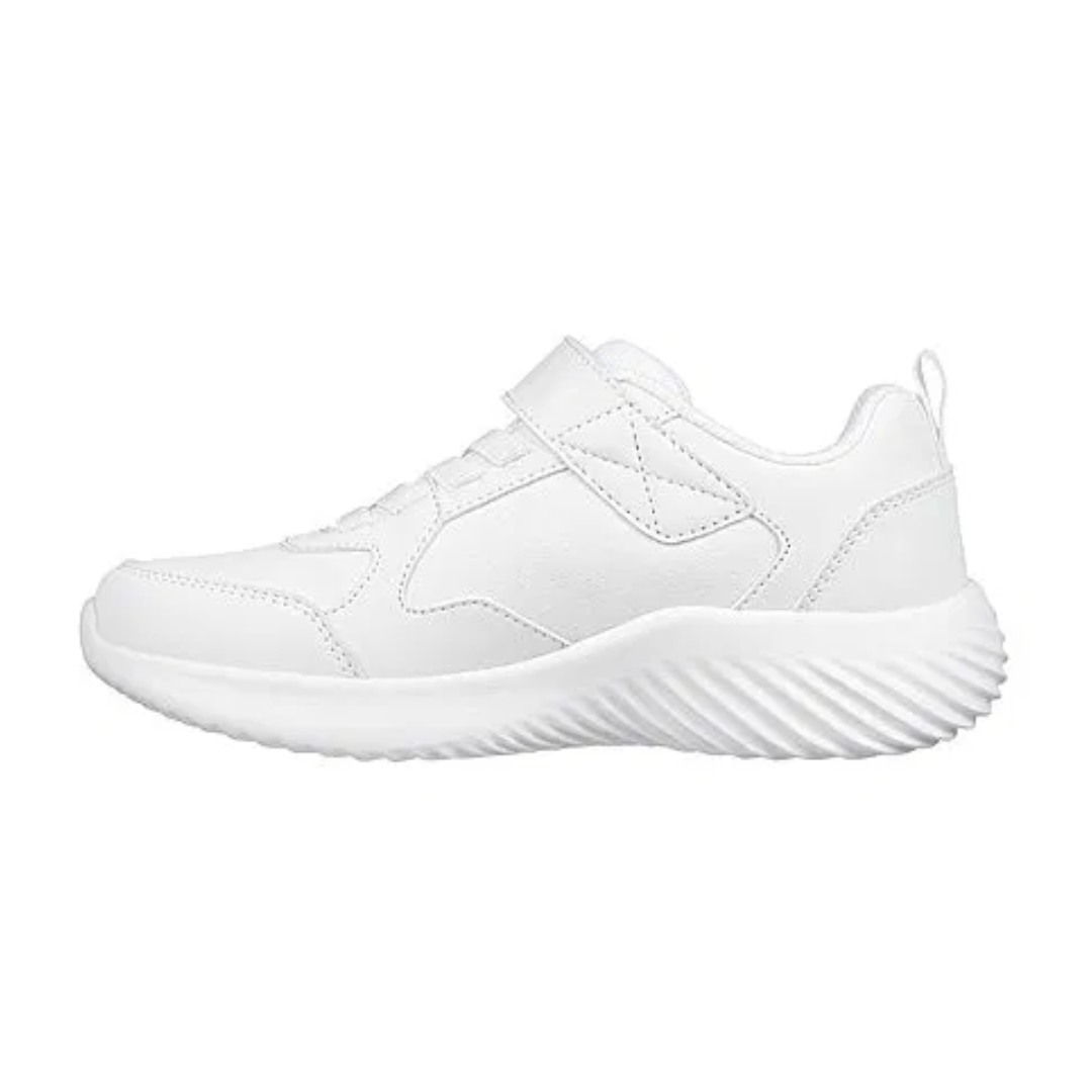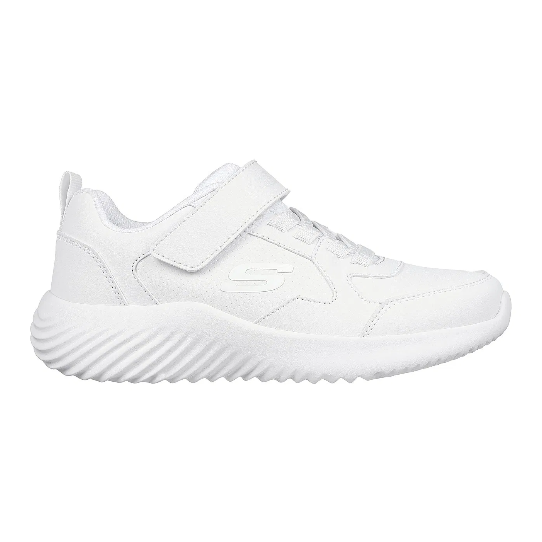 Zapatillas Skechers Escolar Bounder, modelo 405626L-WHT, destacan por su diseño deportivo en color blanco, pensado para el uso escolar diario. Confeccionadas con materiales ligeros y duraderos, ofrecen comodidad y resistencia durante todo el día. La plantilla Memory Foam se adapta a la forma del pie, brindando un ajuste suave y personalizado. Su entresuela con amortiguación absorbe los impactos, mientras que la suela antideslizante garantiza estabilidad en diversas superficies. El cierre de velcro asegura un ajuste rápido y práctico, ideal para estudiantes activos.