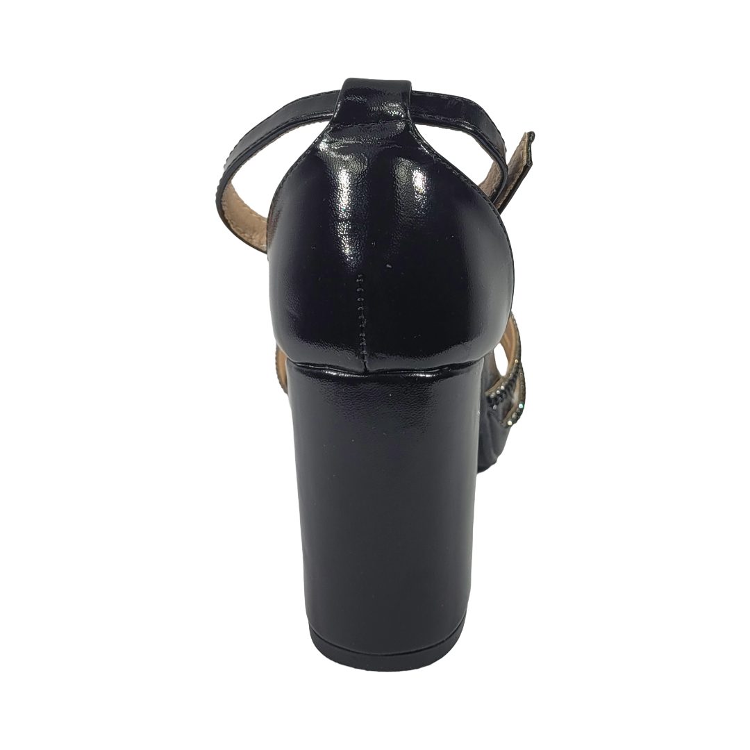 Material y diseño: Elegantes sandalias en negro charol con tiras delicadas que aportan sofisticación y brillo al look.