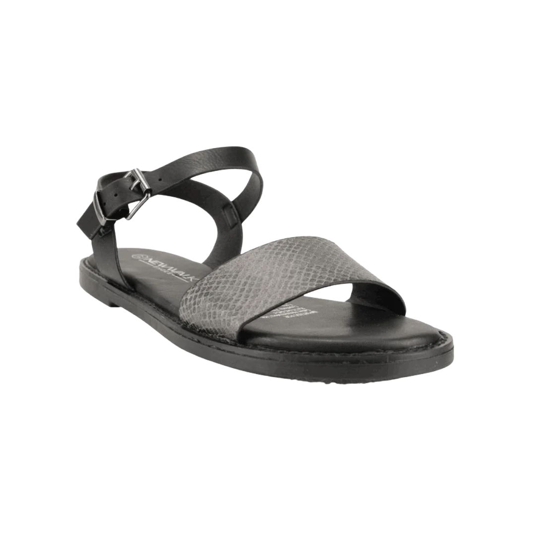 Material y diseño: Sandalias confeccionadas en material sintético negro con acabado elegante y detalles delicados.