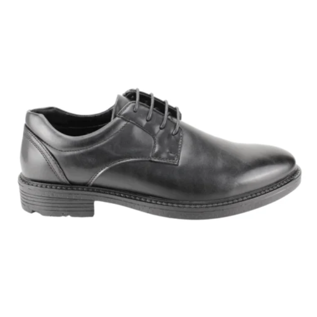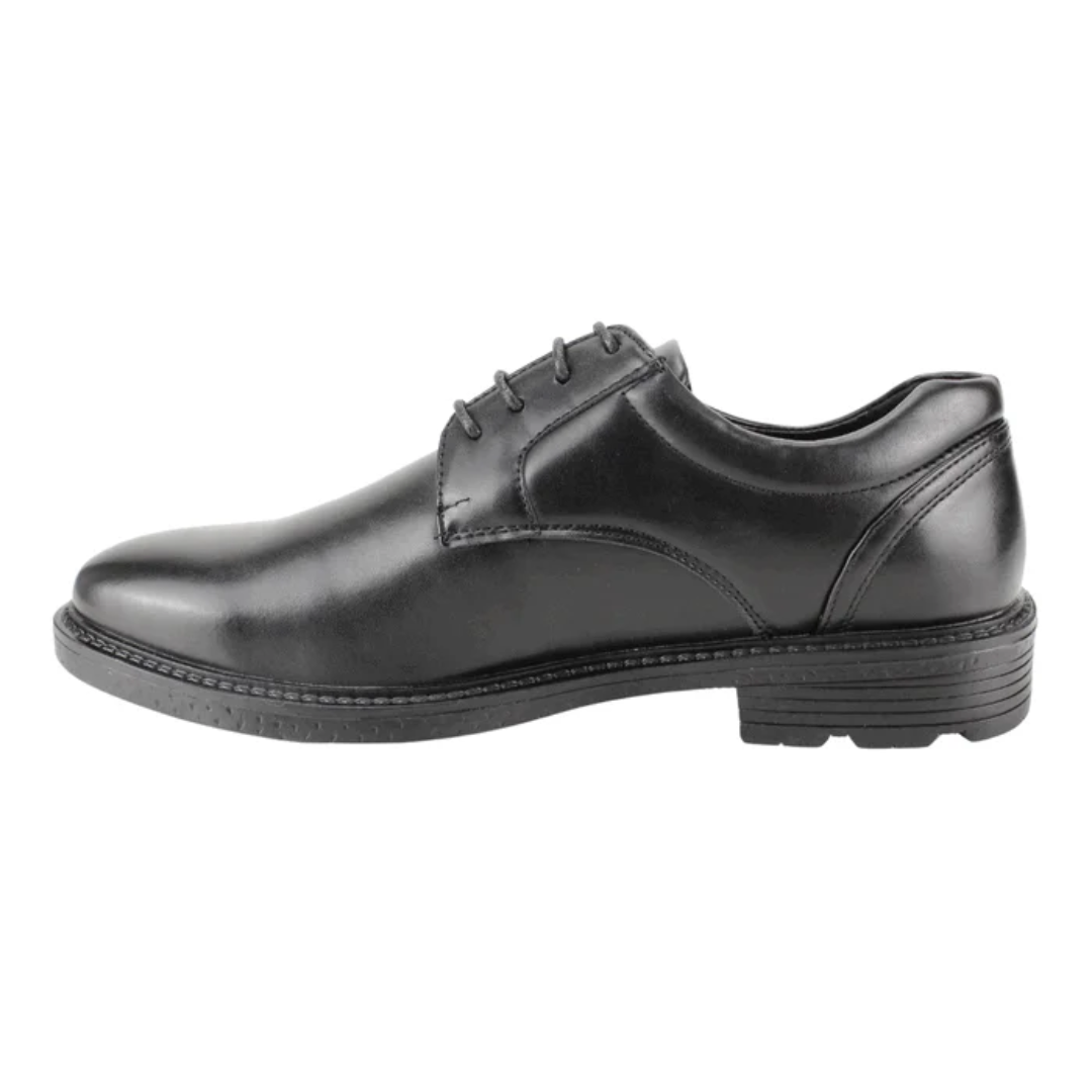 Zapato de vestir para hombre New Walk en color negro. Estilo Formal. Diseñado para brindar sofisticación y comodidad en eventos formales, oficina o reuniones importantes. Fabricado en cuero sintético de alta calidad con acabado liso y costuras reforzadas. Cuenta con suela antideslizante para mayor seguridad y confort en cada paso. Su diseño con cordones ofrece un ajuste preciso, ideal para combinar con traje, pantalón de tela o un look ejecutivo. Taco cuadrado de 3 cm de altura y caña de 6,5 cm de alto.